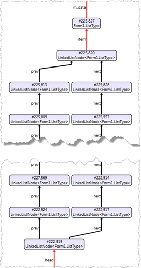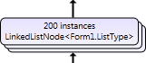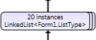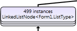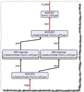 An instance graph can easily become much larger than can be conveniently presented visually. To avoid presenting too large graphs, .NET Memory Profiler will reduce the graph by combining groups of instances and roots into single graph nodes. The profiler tries to select groups so that the overall structure of the graph is affected as little as possible. The example below shows how instances are combined in a graph that contains a long linked list: