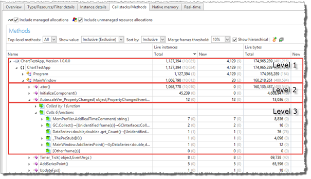 The assembly/module, type, and namespace that contains the base method. This level presents summary information from child items in the tree. For example, the Live instances summary information for a type includes the sum of all live instances created by all methods in the type. This level is only included if the Show hierarchical checkbox is checked.Base method