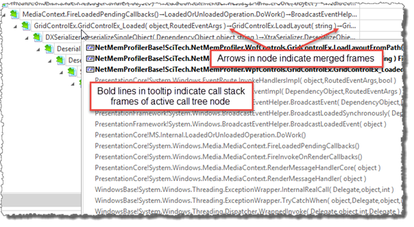To prevent that the call tree becomes very deep, the profiler will merge call stack frames with little or no unique information into a single node (an arrow indicator, ‘→', is used to indicate multiple frames in a node). All frames of the partial call stack are presented in a tooltip.