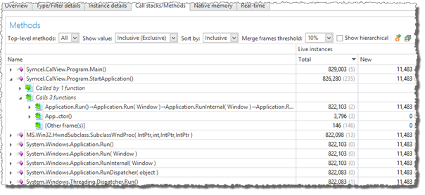 By default, the methods tree now presents two values at the same time, both information about allocations performed by the method itself (exclusive) and allocations performed by the methods and all called methods (inclusive). How the values are presented and sorted can be selected using the Show value and Sort by fields.