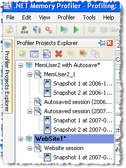 The set of projects in the projects explorer and the active project are saved when the profiler exits, and it is reloaded the next time .NET Memory Profiler is run. When running .NET Memory Profiler under Visual Studio, the information about profiler projects is saved in the user settings of the active solution.