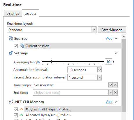 The layouts page is used to define the real-time layouts in the profiled session. This is similar to the Settings and series pane used under the real-time page, except that no live real-time data is included.