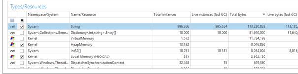 This column shows the total number of type or resource instances that exists. For managed types, this includes both instances that are reachable and instances that cannot be reached.Live instances (last GC)