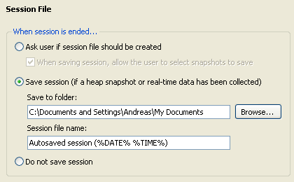 If this option is selected, no user interaction is needed and the session file will be saved to a pre-defined location. The location is defined by the Save to folder textbox and the Session file name textbox. Clicking the Browse button will bring up a folder browser, which can be used to select the “save to” folder. The file name can include the strings %DATE% and %TIME%. These strings will be replaced with the current date and time when the session is saved. Note that the session will only be saved if at least one snapshot has been collected or if real-time data have been collected
