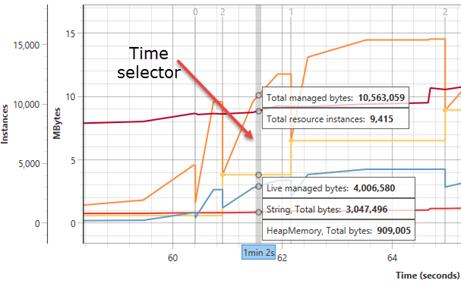 The time selector is used to select the time for which the real-time information should be presented. It is enabled using the Show time selector command. When the time selector is enabled, the mouse can be moved over the graph to select the time for the real-time data. The numbers in the statistics view and the Types/Resources table will be updated to reflect the selected time. There can be a slight delay until the updated values have been retrieved, especially when remote profiling. During this delay, the old numbers will be presented in a gray color.