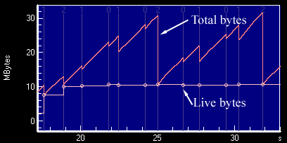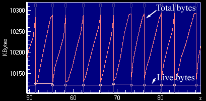 This graph shows a scenario that is optimal for the garbage collector; only generation #0 collects are needed to keep the Total bytes close to the Live bytes, and the heap utilization is very efficient. The overhead is only about 200 Kbytes.