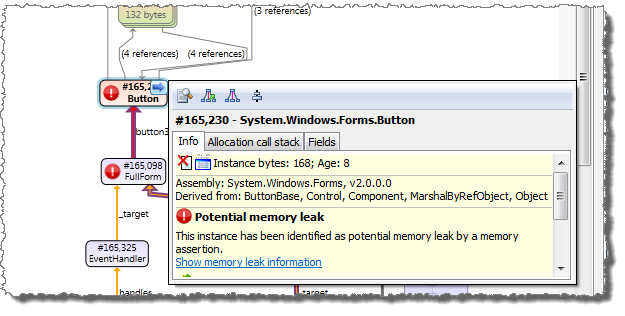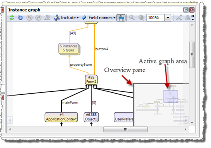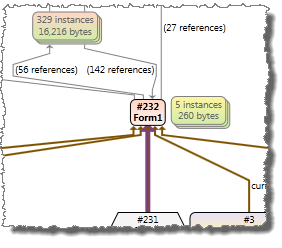If related instances like other reachable instances and other referrer instances are included, the number of references between them and other root path instances can become significant. Including all these references in the graph can make the graph harder to follow. Therefore it is possible to reduce the number of included edges by using the command Reduce edges. If edges are reduced, less important reference edges are not included in the graph. However, this can also cause instance nodes to become disconnected (see screenshot below).